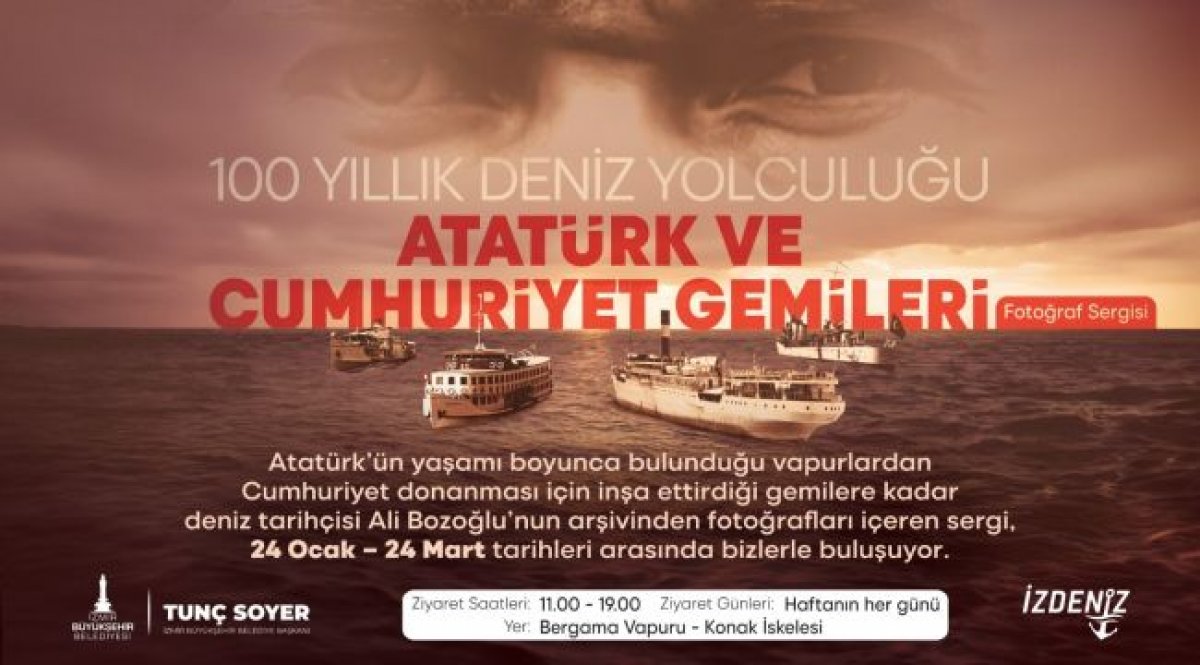Büyük Önder Mustafa Kemal Atatürk’ün denizlerde bağımsızlığa ve denizciliğe verdiği önemi anlatan “100 Yıllık Deniz Yolculuğu: Atatürk ve Cumhuriyet Gemileri Fotoğraf Sergisi”, İZDENİZ A.Ş.’nin organizasyonuyla 24 Ocak’tan itibaren İzmirlilerle buluşacak.
