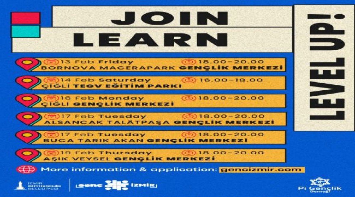 15–30 yaş aralığındaki gençlere açık olan programa, A2–B1 seviyesinde İngilizce bilgisine sahip katılımcılar başvurabiliyor. Ücretsiz olarak düzenlenen etkinliklerin kontenjanı sınırlı. Öte yandan, İngilizceye daha kapsamlı bir başlangıç yapmak isteyen gençler için 16 Şubat Pazartesi günü Alsancak Talâtpaşa Gençlik Merkezi’nde başlayacak, toplam 60 saatlik İngilizce eğitim programı da başvurulara açık. “English Speaking Club” etkinlikleri ile İngilizce eğitim programına ilişkin detaylı bilgi ve başvuru koşullarına gencizmir.com adresinden ulaşılabiliyor.