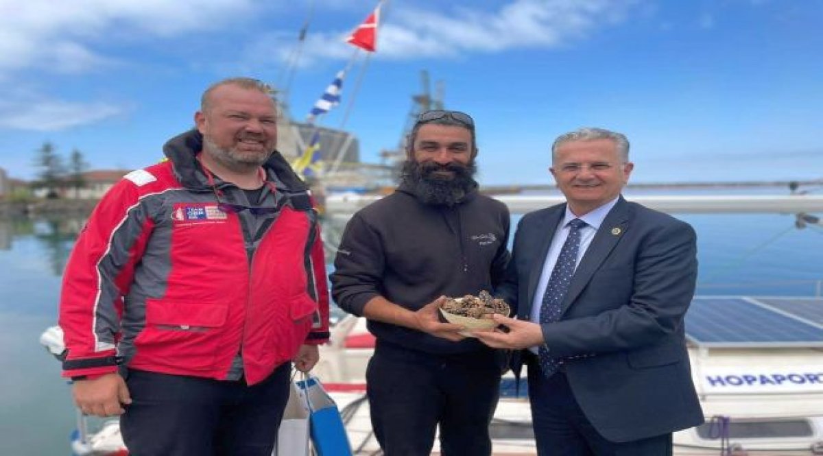 Gelecek için Yelken Açıyoruz yolculuğa öncülük eden Başkan Utku Gümrükçü, yolculuk sürecinde yelken ekibine destek olan Çeşme Belediye Başkanı Ekrem Oran ve Marmaris Belediye Başkanı Mehmet Oktay'a seyir esnasında kırılan makaralardan geri dönüştürülerek yapılan plaketleri takdim etti.