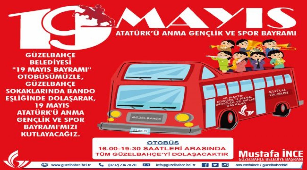 19 Mayıs Atatürk’ü Anma, Gençlik ve Spor Bayramı nedeniyle Güzelbahçe Belediyesi, üstü açık otobüsle bando ve müzik eşliğinde Güzelbahçe sokaklarında tur atacak.